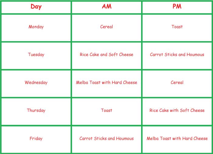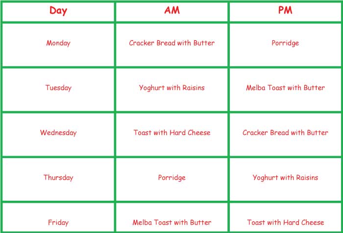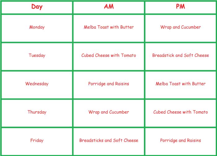 NB: All snacks provided are served with 50% Fruit and Milk or Water